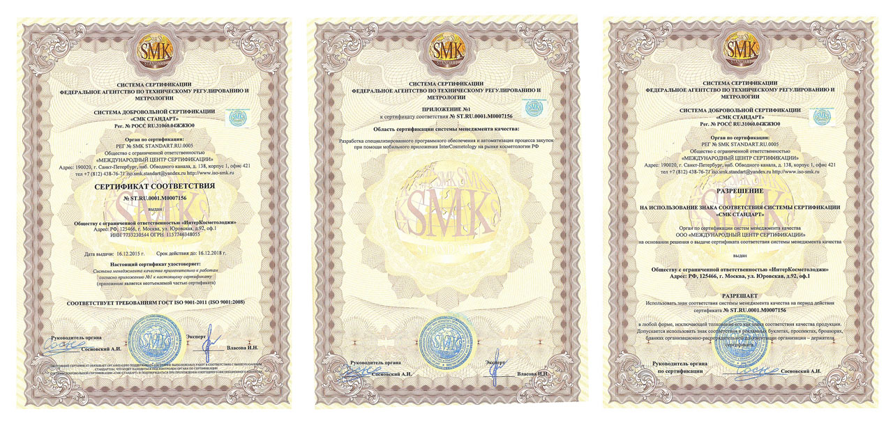 Приоритетом InterCosmetology является качество обслуживания клиентов и предоставление услуг. Именно поэтому наша организация прошла процесс сертификации по системе ISO9001.