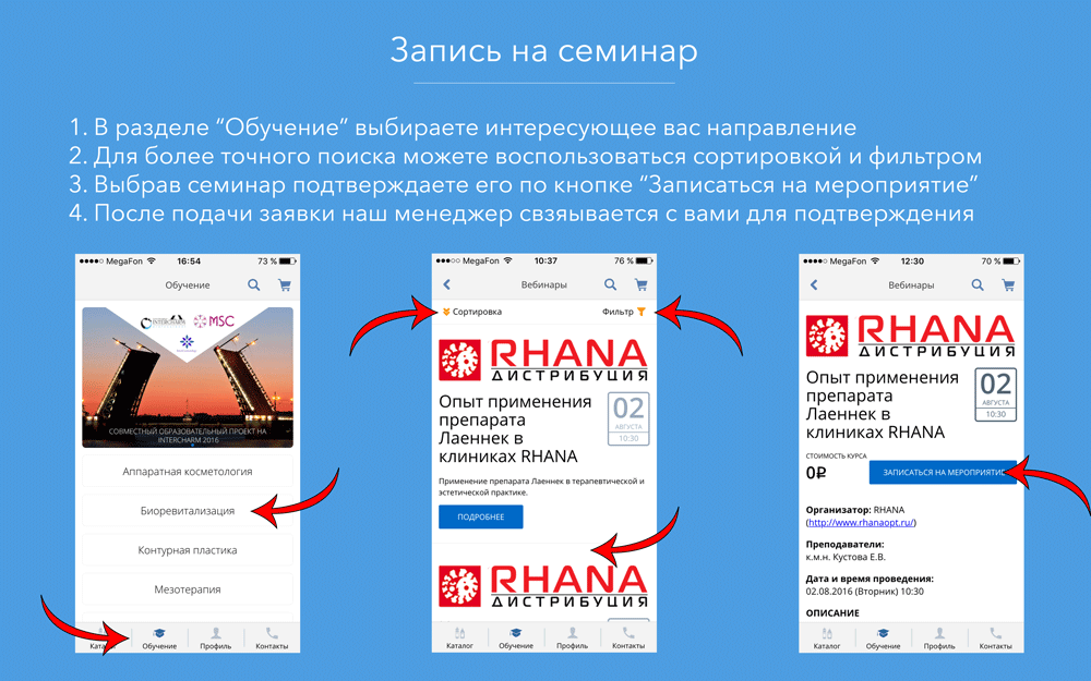 Приложение InterCosmetology имеет красивый и удобный интерфейс, благодаря чему любой специалист в режиме реального времени в одном месте получает доступ к каталогу продукции и возможность онлайн записи на обучающие семинары, проводимые поставщиками.